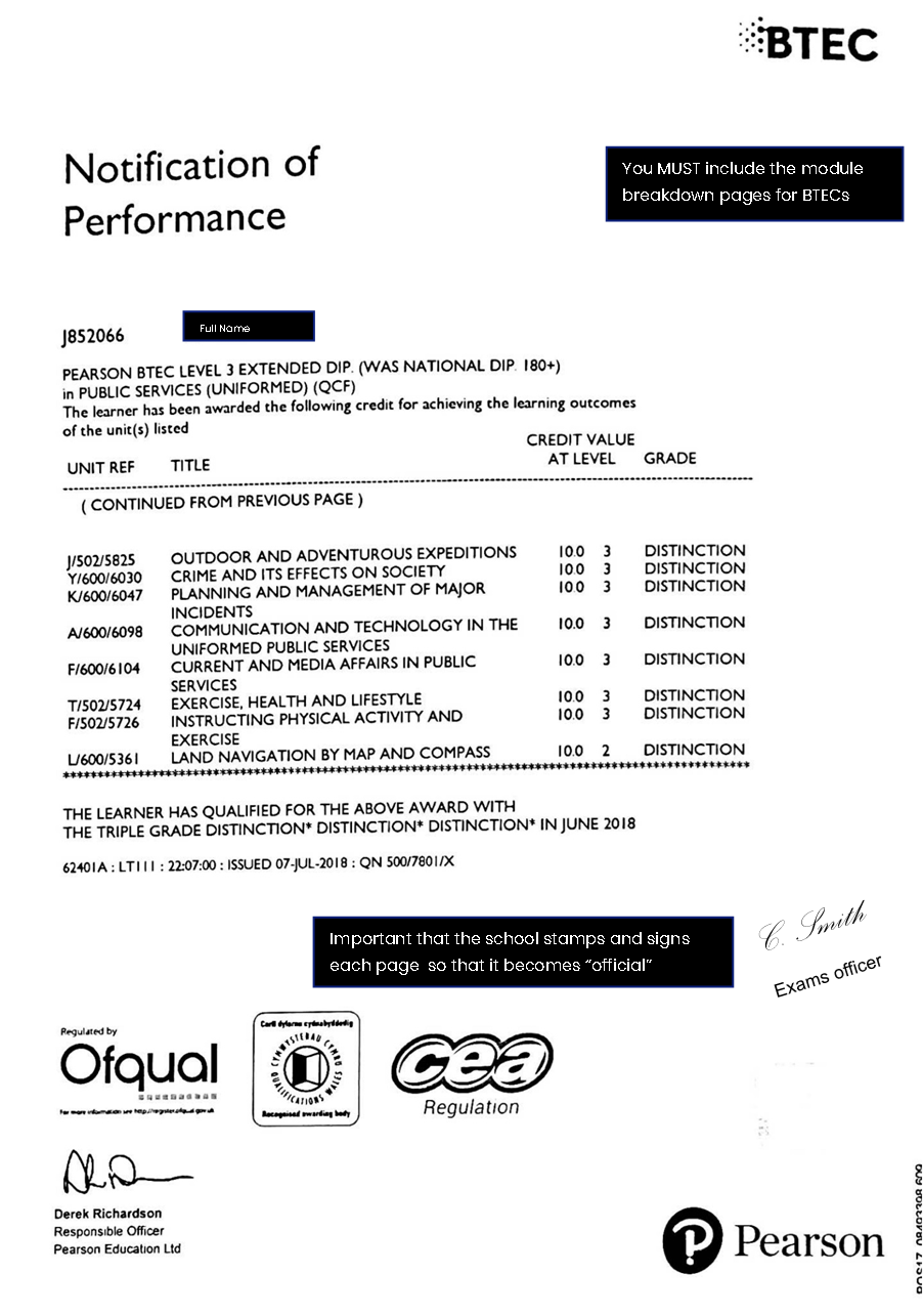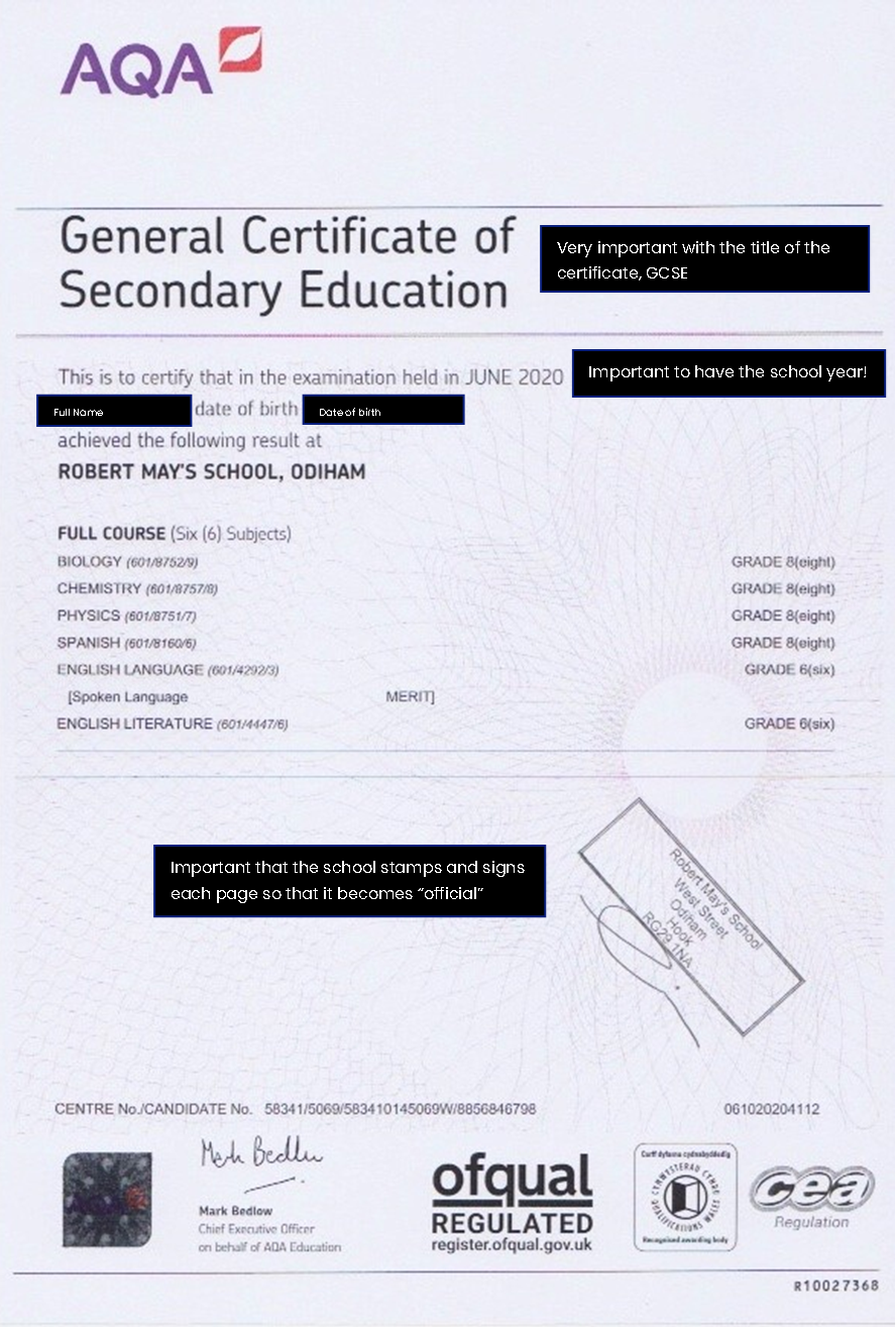 Take colour photocopies into your school and ask a teacher/Principal/exams officer to stamp and sign the photocopies. Then take clear PDF scans of the stamped and signed transcripts. If you or a parent absolutely cannot go into school, take clear scans of your transcripts, email them to a teacher/Principal/exams officer and ask them to print them, stamp and sign and scan them back to you in colour. You will need to ask someone you got on very well with to do this as it is a lot of work, you must ask politely and explain how important this is for your university. Your certificates need to look like the below to be accepted by the evaluation companies.